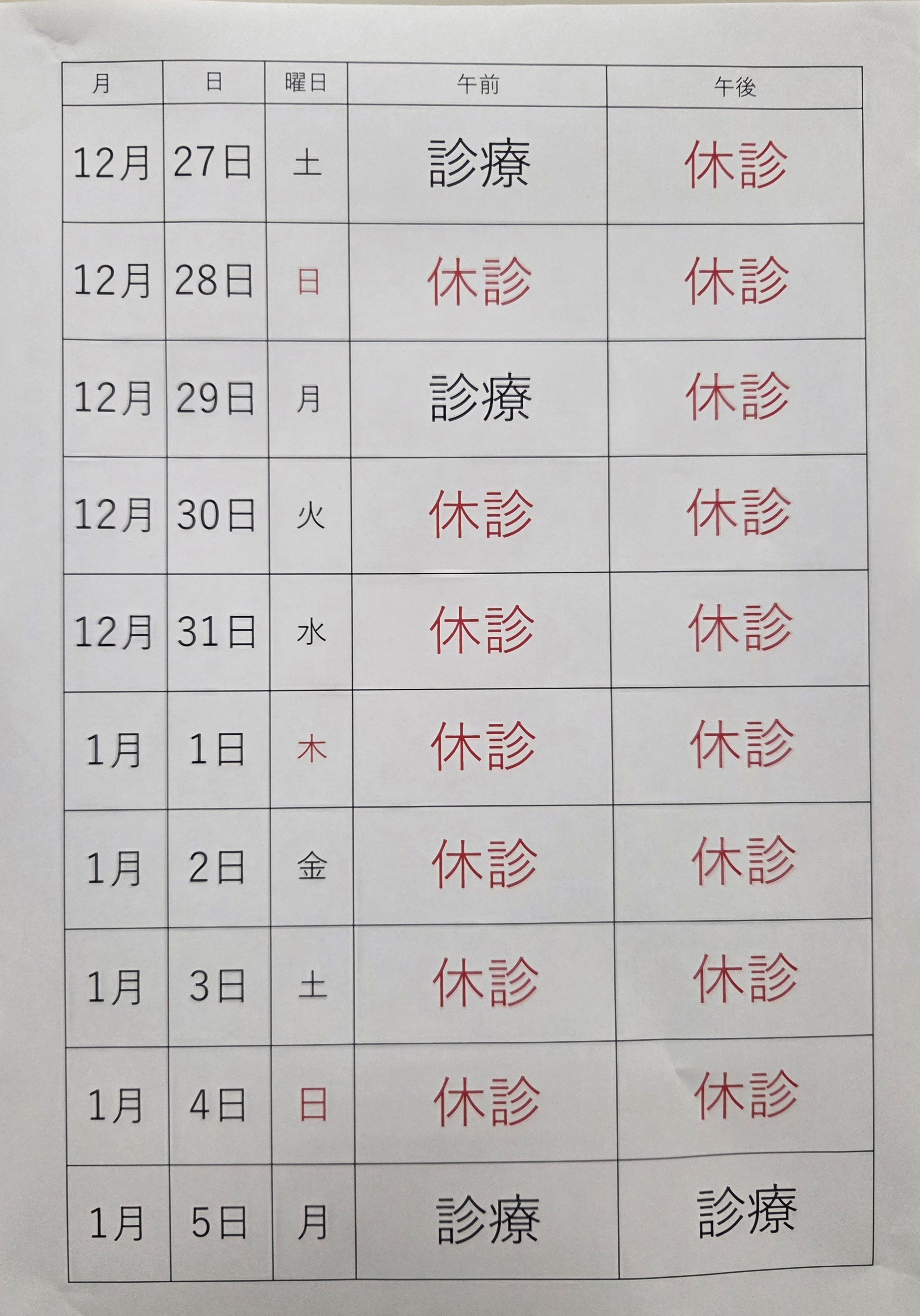 年末は12月29日の午前中までの診察で29日午後から1月4日まで休診とさせていただきます。